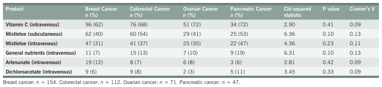 Table 7 shows the most common parenteral therapies recommended to participants. Only 6 parenteral therapies were recommended to ≥ 10% of participants in at least one cancer type. These included IVC, IV and subcutaneous (SC) mistletoe, general nutrient infusions, and infusions of artesunate and dichloroacetate (DCA). IVC was by far the most common, recommended to at least 60% of participants across cancer types. Subcutaneous mistletoe was recommended to at least 40% of participants, and IV mistletoe was recommended to at least 30% of participants across cancer types. Dichloroacetate and artesunate were least common, both recommended to ≤ 10% of participants in total. No parenteral therapies showed significant non-uniformity between cancer types based on the Chi-squared test.