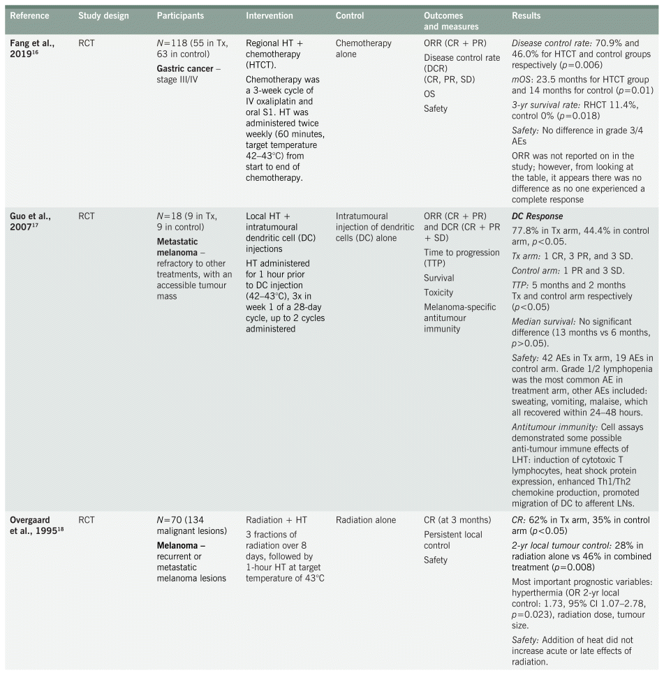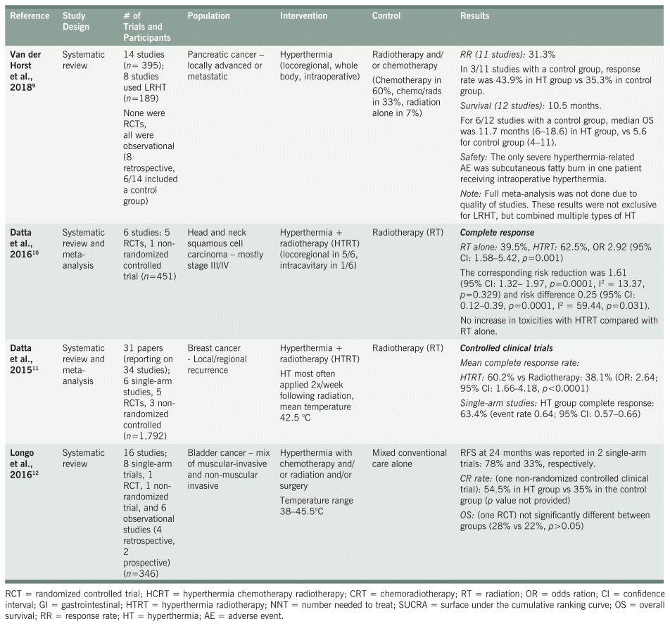 Conclusions: Locoregional HT is a promising adjunct treatment to chemotherapy and radiotherapy for a variety of cancer types. To determine in what situations this therapy could be best applied, more high-quality well-controlled studies are needed.