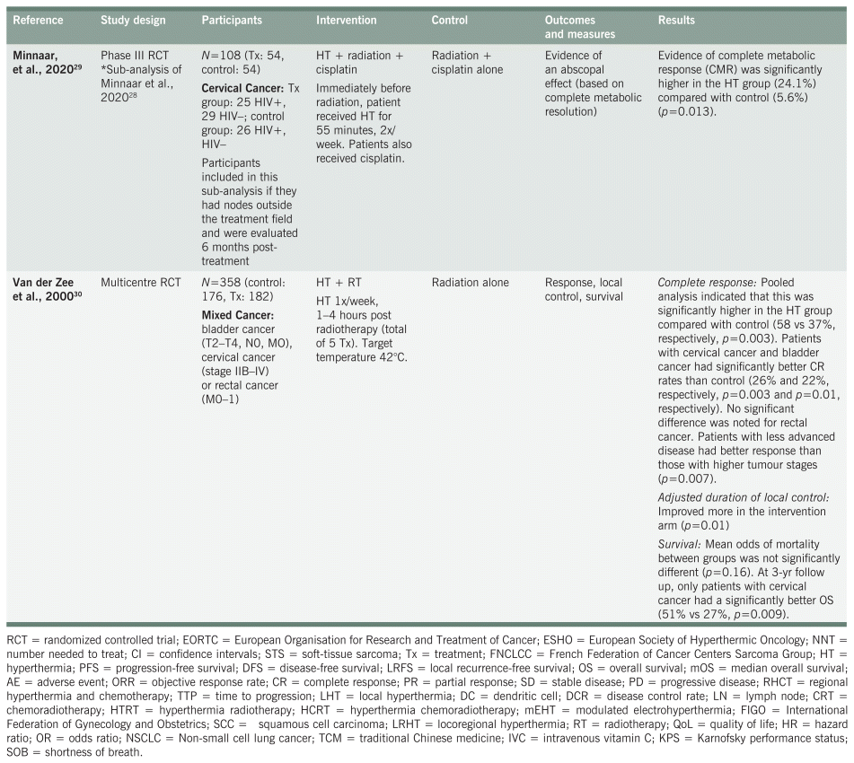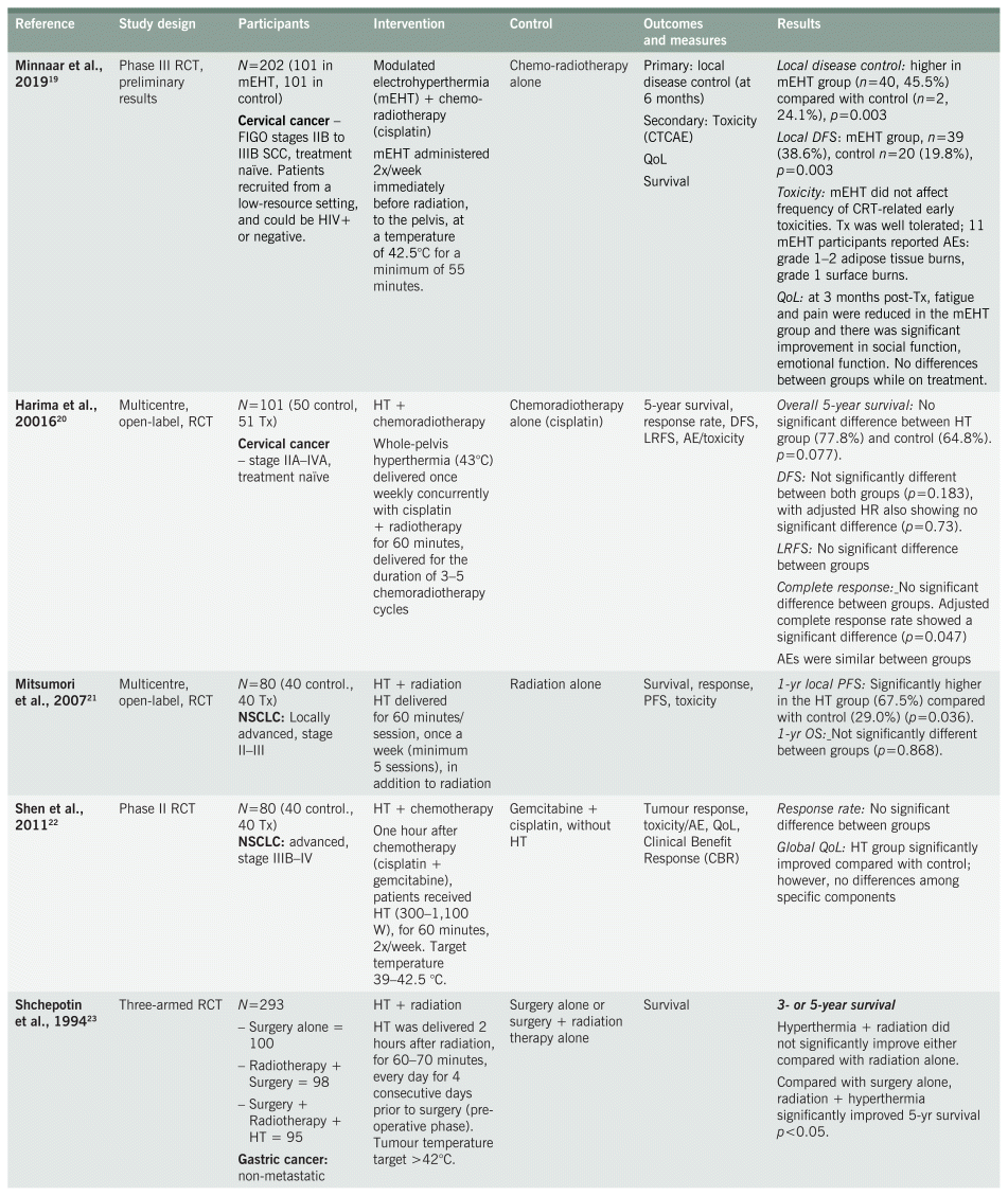 Three papers published data from an ongoing phase III RCT investigating modulated electro-hyperthermia (mEHT) with CRT, compared with CRT alone, for patients with stage IIB–IIIB cervical cancer.19,28,29 Patients from a low-resource African setting were treated with mEHT twice weekly before RT in addition to cisplatin-chemotherapy. The first publication reported early results.19 At six months, the local disease control and local DFS were superior in the mEHT group than in the control (45.5% vs 24.1%, p = 0.003; 38.6% vs 19.8%, p = 0.003, respectively). The second publication found no significant difference in treatment toxicity between study arms, and AEs attributed to mEHT were minor.29 There was some evidence of QoL improvement, specifically for cognitive function, post-treatment fatigue, and social and emotional functioning in the HT arm. The third publication evaluated the abscopal effect in a subgroup of patients with involved lymph nodes outside of the treatment field.28 Participants in the LRHT arm experienced significantly higher complete metabolic response (abscopal effect marker) than the control (24.1% vs 5.6%, p = 0.013).